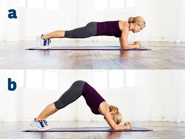 ใช้ศอกดันตัวขึ้นอยู่ในท่าแพลงก์ หายใจเข้าพร้อมกับค่อยๆ ยกสะโพกขึ้นอีก