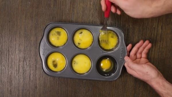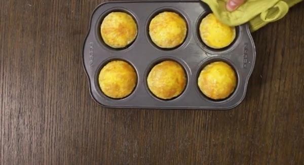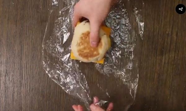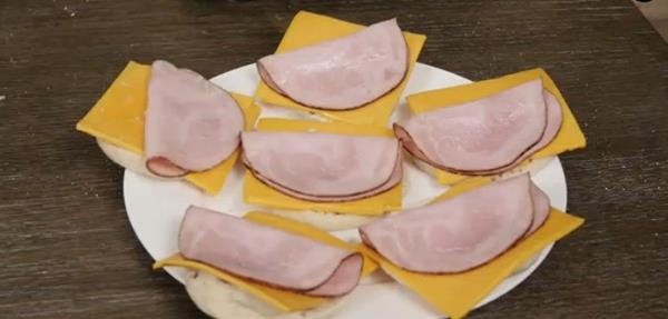 3. วางแฮม ชีส บนมัฟฟิน นำไข่ที่เตรียมไว้วางตามลงไป แล้วเอามัฟฟินอีกชั้นมาประกบ