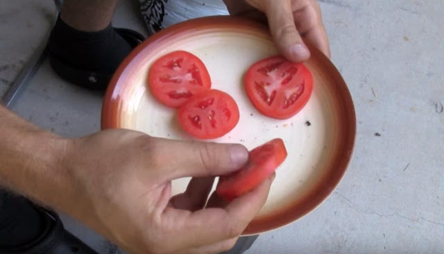 ขึ้นตอนแรก ให้นำมะเขือเทศมาหั่น ตามรูปด้านบน ประมาณ 3-4 ชิ้น