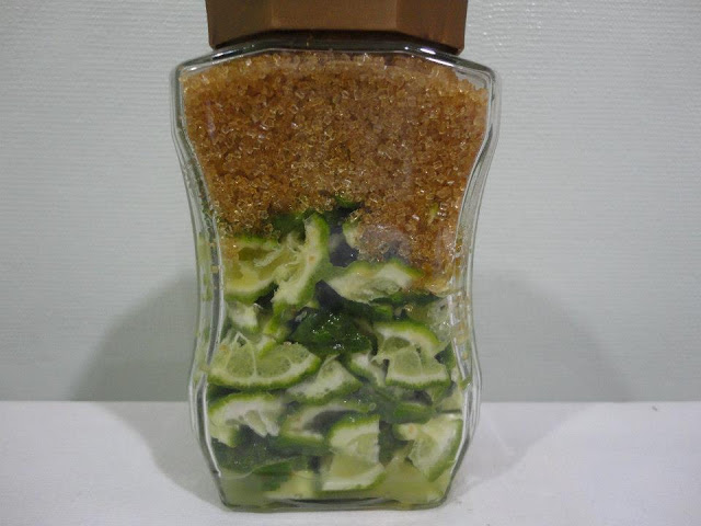 ใส่น้ำตาลทรายแดงกลบไว้ด้านบน ในอัตราส่วน มะกรูด 3 ส่วน ต่อ น้ำตาลทรายแดง 1 ส่วน ไม่ต้องเติมน้ำนะคะ เพราะว่าน้ำตาลจะค่อยๆ ดึงวิตามินและสารสำคัญอันเป็นประโยชน์ทั้งหลายออกมาจากมะกรูดเองค่ะ