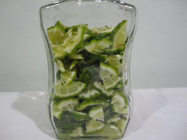 วิธีทำนำมะกรูดมาล้างและหั่นเป็นชิ้นเล็กๆ เอาเมล็ดออก ใส่มะกรูดลงในขวดแก้วที่เตรียมไว้ ให้เหลือพื้นที่ด้านบนเล็กน้อย