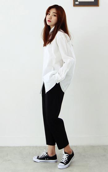 เสื้อเชิ้ตแขนยาวกับกางเกงขายาว เติมความเท่ด้วยรองเท้าผ้าใบ เฟี้ยวสุด ๆ