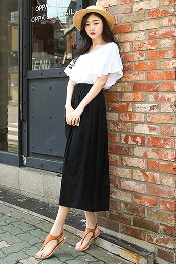 กระโปรงสายเดี่ยวตัวยาว กับเสื้อกล้าม หมวกใบเก๋ และรองเท้าแตะรัดส้น สวยลงตัว