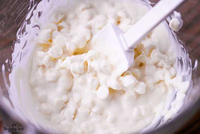 2) ละลายไวท์ช็อกโกแลตในไมโครเวฟประมาณ 1 นาทีแล้วคนๆ ให้ละลายเป็นเนื้อเดียว
