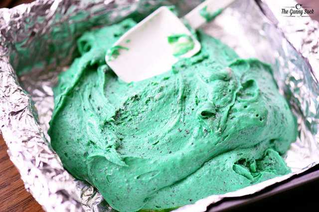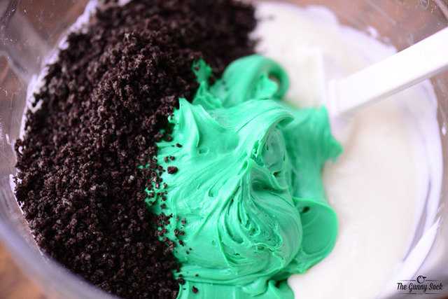 3) เติมกลิ่นมินต์ลงใน frosting แล้วนำไวท์ช็อคที่ละลายแล้วเทลงไป ตามด้วยโอริโอ้ที่สับไว้