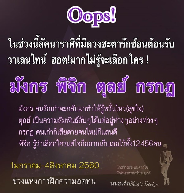 วันที่ 14 กุมภาพันธ์ 2560 ต้อนรับวันแห่งความรักโลกสีชมพูของคนมีคู่ ด้วยคำทำนายของ หมอเค้ก Magic designsหมอดูชื่อดังในโลกออนไลน์ ได้เผยการทำนายของ 4 ราศี ที่ในช่วงนี้ลัคนาราศีที่มีดวงชะตารักซ้อนต้อนรับวาเลนไทน์ อื้อหือฮอตฉ่ามาก.. มากจนไม่รู้จะเลือกใครเลย !