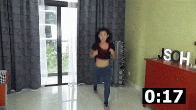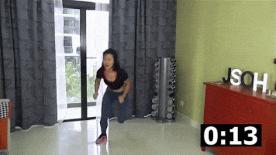 ตั้งการ์ดมือที่หน้าอก กระโดดท่าสควอทหมุนตัวจากด้านหน้ามาด้านหลัง กระโดดหมุนกลับไปข้างหน้าอีกครั้ง ทำซ้ำกันให้ครบ 20 วินาที