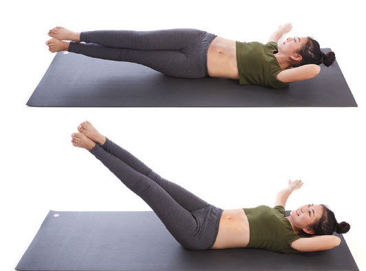 นอนหงายหน้าตัวตรง ใช้แขนข้างซ้ายวางไว้ใต้ศีรษะ ส่วนแขนข้างขวายื่นตรงออกไปข้างลำตัว และคว่ำแขนลง จากนั้นบิดสะโพกมาด้านซ้าย แต่ให้พยายามทรงตัวให้นอนตรงไว้ แล้วพยายามยกขาทั้งคู่ลอยทแยงขึ้นสูงประมาณ 45 องศา จากนั้นลดขาลงช้าๆ แล้วกลับมาที่ท่าเริ่มต้น สลับทำด้านขวา โดยต้องสลับทั้งท่าแขนที่อยู่ใต้ศีรษะและแขนที่เหยียดด้วยเช่นกันจนครบ 30-40 เซ็ท