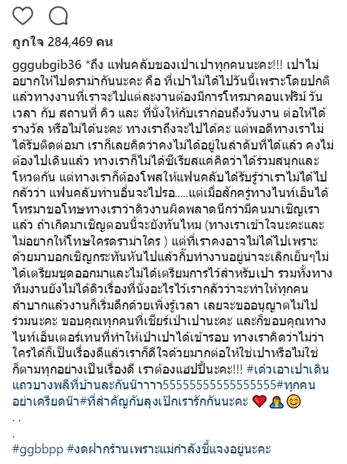แต่หากกุ๊บกิ๊บคิดว่าทางเราไม่เชิญ พี่บอยก็ขอโทษ ก็ถือว่าที่ผ่านมาที่เราเข้าใจว่าเชิญแล้วเป็นไม่เชิญ ไม่เป็นไร เราไม่นอยด์ เดี๋ยวพรุ่งนี้เช้าเจอกัน พี่ก็ตื่นมารอหนูเลย รอเคลียร์หน้าสตูดิโอเลย เราคิดว่ากุ๊บกิ๊บเข้าใจเรา แต่แฟนคลับดราม่าหนักมาก ด่าเราเหมือนเราเป็นเปรี้ยวฆ่าคน ใจเย็นๆ ส่วนที่บอกว่าอุตส่าห์โหวตเป่าเปา ขอบคุณค่ะที่เชียร์น้อง แต่เงินทุกบาทที่เราทำงานมาให้ท่านโหวต มันไม่ได้เงินอะไรเยอะหรอก เราต้องแบ่งหลายส่วน ซึ่งการจัดงานเราขาดทุกทุกปี ไม่ได้อยากเรียกเสียงโหวตอะไร อยากให้แฟนคลับน้องเป่าเปาเข้าใจ