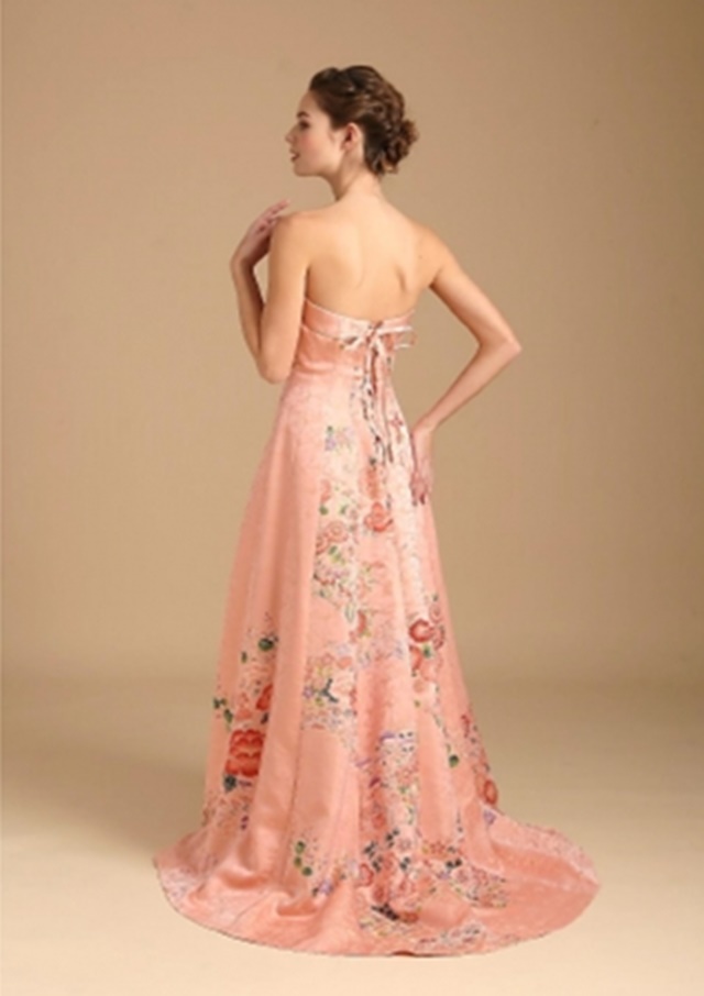 ชุดเจ้าสาวผ้าไหมสีชมพู ประดับประดาด้วยดอกไม้หวานๆ ทั้งดอกโบตั๋นและดอกเบญจมาศ