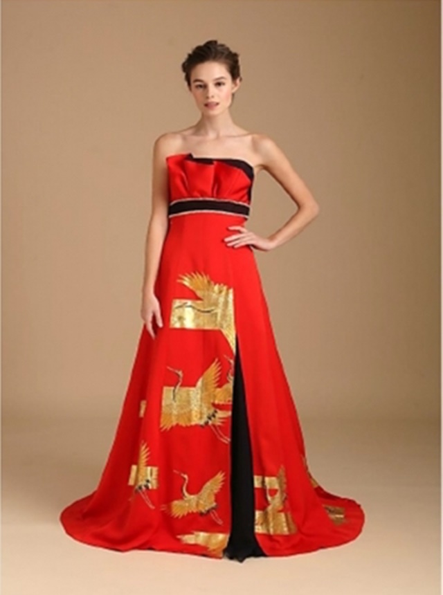 ชุดเจ้าสาวสีแดงสด ตกแต่งลวดลายด้วยนกกระเรียนสีขาวที่กำลังโผบินท่ามกลางธรรมชาติและหมู่มวลดอกไม้ ทั้งดอกเบญจมาศสวน (หรือเก๊กฮวย) ใบเมเปิ้ล และสายน้ำเย็นฉ่ำสีน้ำเงินตัดกับพื้นสีแดง