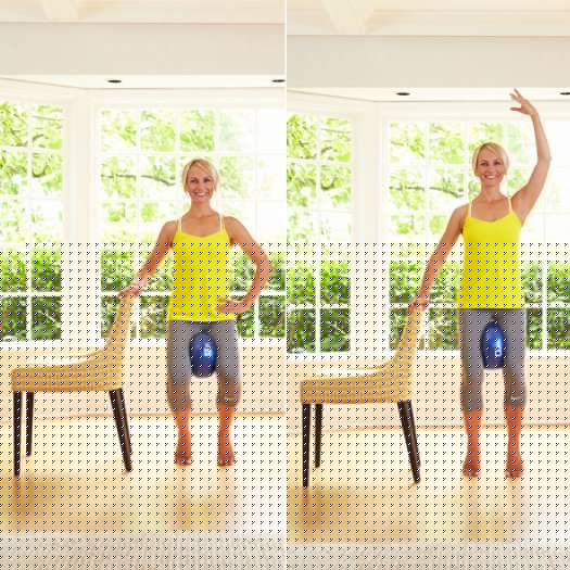 1.ใช้มือจับเก้าอี้หรือโต๊ะช่วยพยุงตัว จากนั้นให้หนีบลูกบอลเล็กๆ ไว้ที่หว่างขา