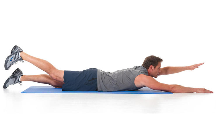 6. Superman ท่านี้ให้นอนคว่ำหน้า แล้วเหยียดแขนขาให้ตรงก่อนจะเงยหย้าไปข้างหน้า พร้อมยกแขนซ้ายและขาขวาให้สูงจากพื้น ทำค้างไว้ นับในใจ 1-3 จากนั้นก็สลับข้าง 10 เซ็ท
