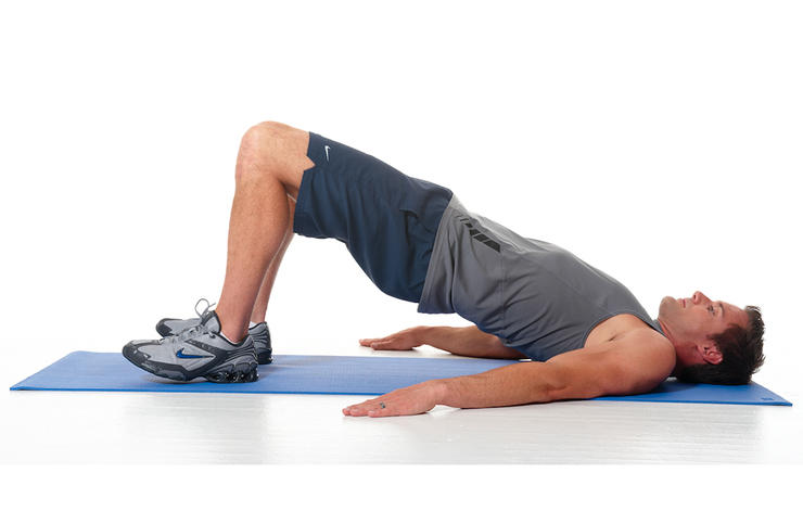 3. Bridge จะเริ่มจากการนอนหงายเหยียดตัวตรงและใช้มือแต่ไปตามลำตัว จากนั้นก็นำเท้าชิดเข้าหาตัวในลักษณะชันเข่า ก่อนจะยกขึ้นพร้อมออกแรงที่แขน พยุงตัว นับ 1-5 ในใจก่อนเอาลง ทำ 3เซ็ต