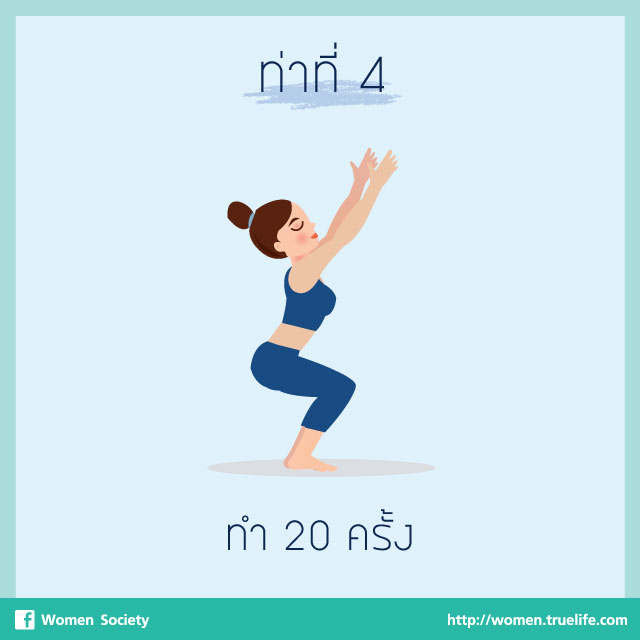 ท่านี้คล้ายกับท่าแรกค่ะ แต่เขย่งปลายเท้าขึ้นสูง แล้วย่อตัวลง เกร็งต้นขา ทำซ้ำ 20 ครั้ง