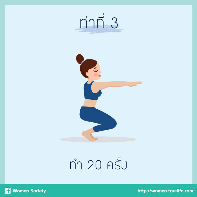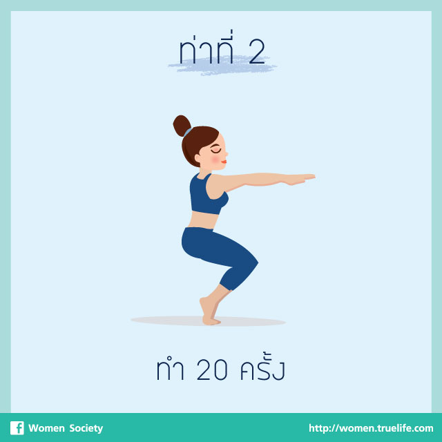 ยืนตรง แขนทั้งสองข้างเหยียดตรงไปด้านหน้า จากนั้นย่อตัวลง เกร็งต้นขา ทำคล้ายๆ กับท่าสควอท ทำซ้ำ 20 ครั้ง